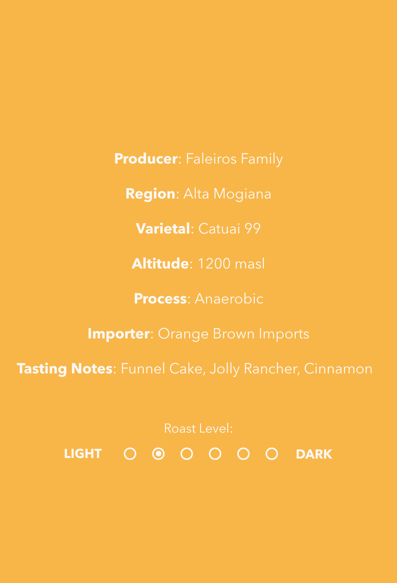 With over a century of coffee-growing heritage, the Faleiros family runs Santa Monica Farm in Brazil’s prized Alta Mogiana region, known for its sweet, high-altitude coffees. They combine traditional expertise with cutting-edge technology, including a custom processing station and the world’s largest suspended drying patio, to craft exceptional specialty coffees. Their dedication to sustainability is evident, with more than 40% of their land preserved, ensuring each reddish-orange coffee cherry is as vibrant in flavor as it is in appearance. In the anaerobic coffee process, harvested coffee cherries are placed in sealed tanks or containers with limited or no oxygen, allowing fermentation to occur under controlled conditions. Specialized yeast or natural microbes break down the fruit sugars over a set period (in Tubaina’s case, 60 hours), producing distinct flavor compounds. This method often results in vibrant, complex profiles—like pronounced fruitiness or unique sweetness—while giving producers precise control over the coffee’s final taste.